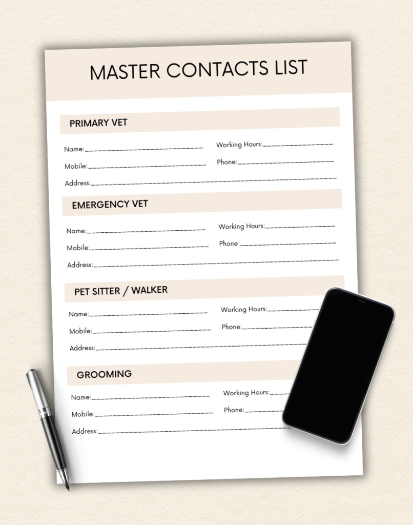 Keep all important contacts together: vet, emergency vet, sitter, and more.